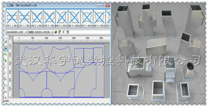 加工范圍:0.2-6.0mm任意材料鋼板的切割成型!可切割各種異形件,電腦直接畫圖,導(dǎo)出加工程序,批量高速切割,效果好,精度高,不掛渣!配合專用的風(fēng)管展開軟件,自動生成圖紙、導(dǎo)出加工程序。操作人員所需要做的就是在軟件中選擇所需要的風(fēng)管樣式,輸入所需要的尺寸,然后調(diào)出加工程序進(jìn)行切割就可以了。既方便快捷、又精確實(shí)用。